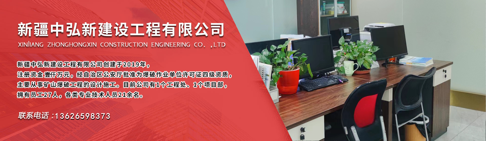 ZHONGHONGXIN CONSTRUCTION ENGINEERING 公 司 簡 介新疆中弘新建設工程有限公司創(chuàng)建于2019年,注冊資金壹仟萬元,經自治區公安廳批準為爆破作業(yè)單位許可證四級資質,主要從事礦山爆破工程的設計施工、礦上采掘施工業(yè)務。目前公司有1個工程處、2個項目部,分...